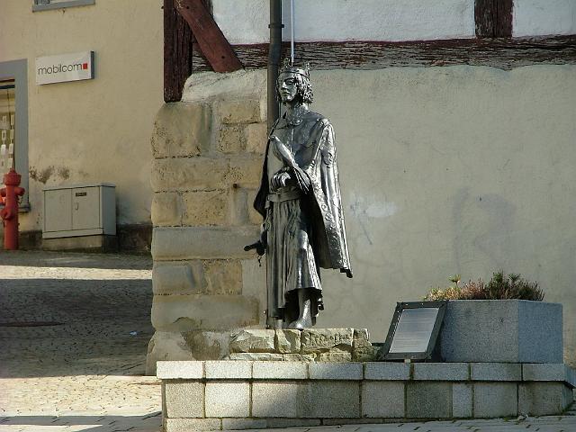 Er hat Pfullendorf 1220 zur Stadt erhoben. Der Falke auf seiner linken Hand erinnert an sein Buch "Über die Kunst, mit Vögeln zu jagen", auch heute noch ein maßgebliches Werk für alle Falkner. |